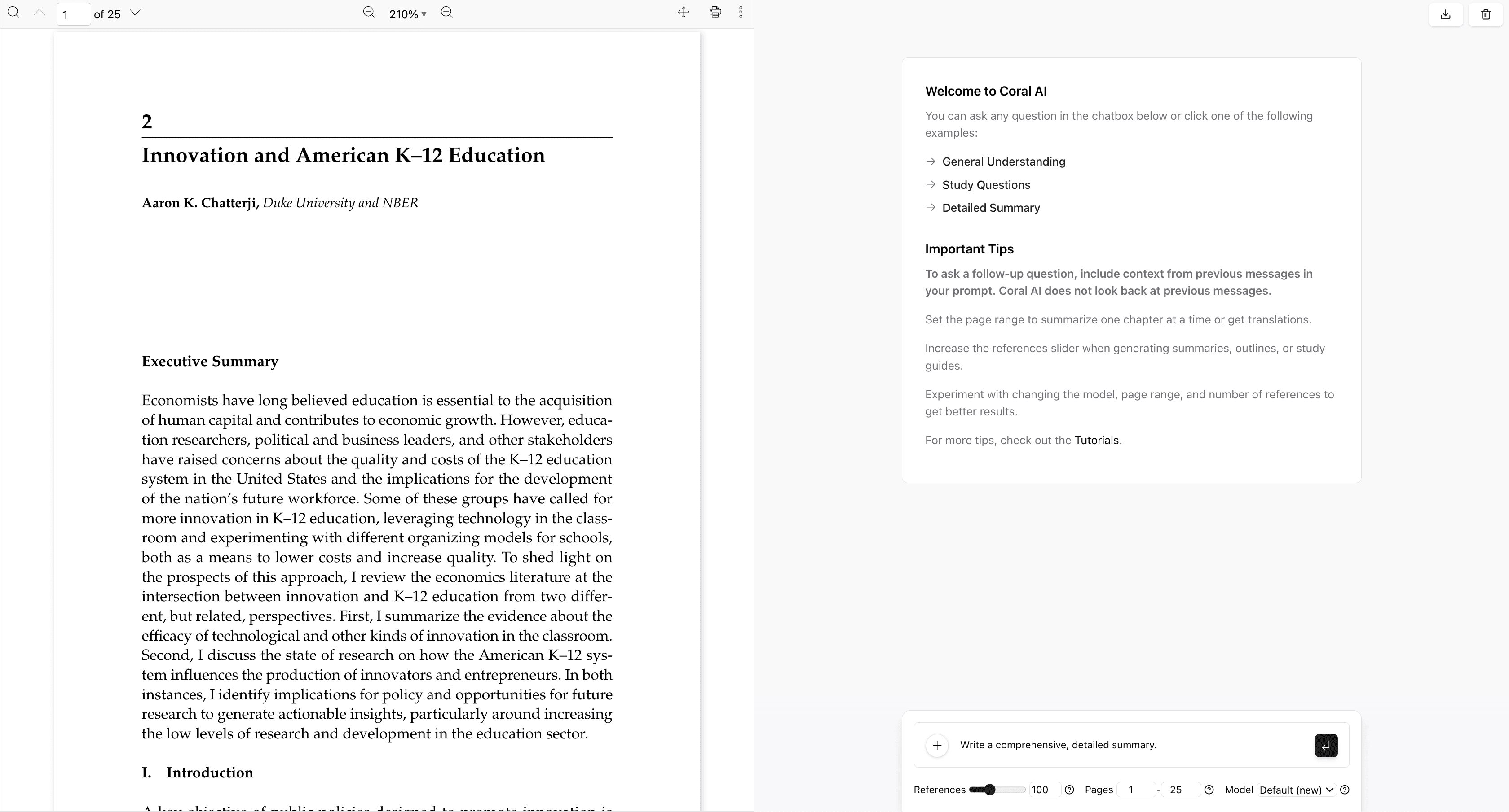 You can use Coral AI to get instant summaries of long documents. It will condense all of the important points in the document into a short easy-to-read format.