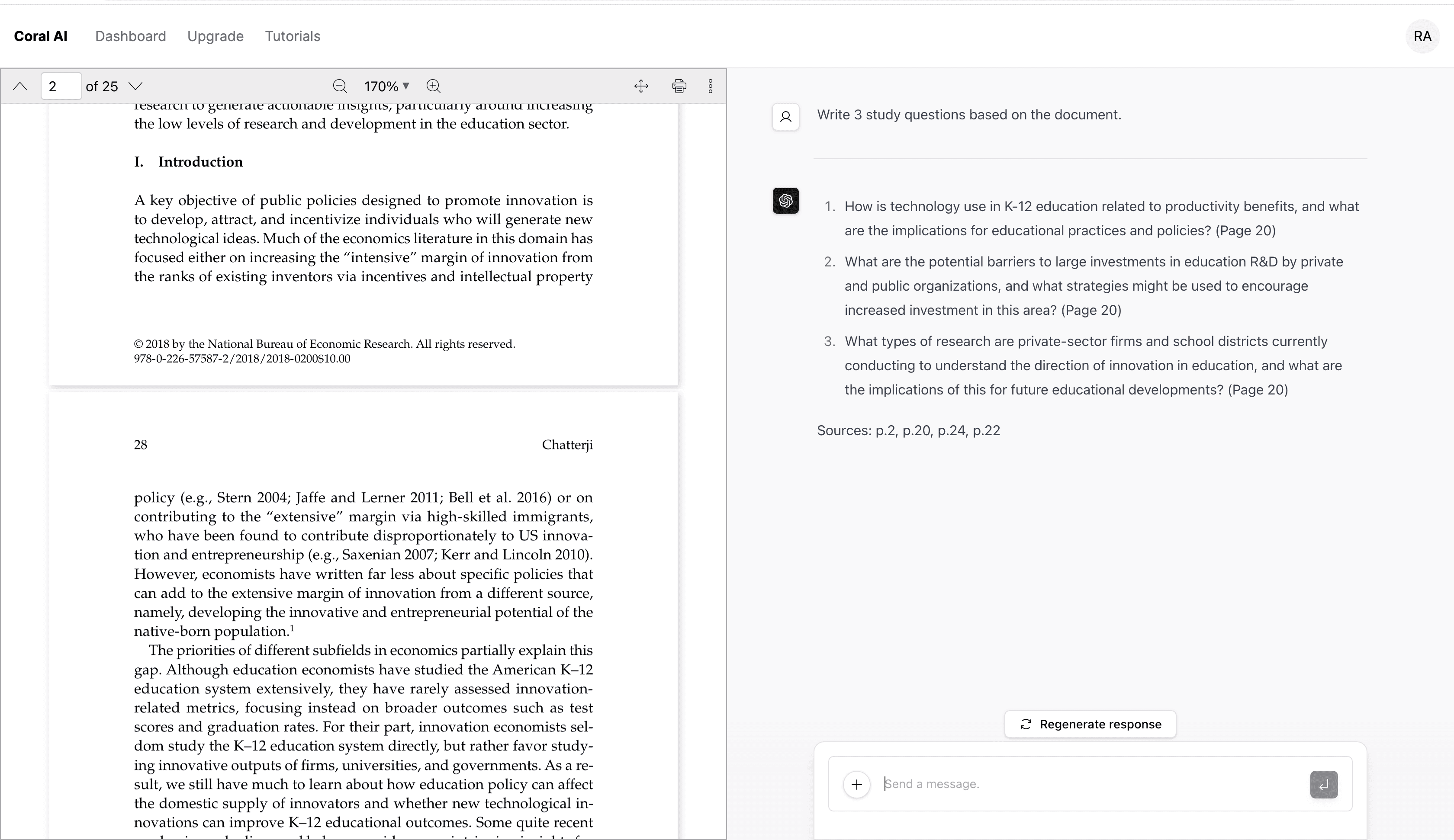 Coral AI will generate study questions and answers based on your document for you in seconds. If you aren’t happy with the results, just click “Regenerate response.”